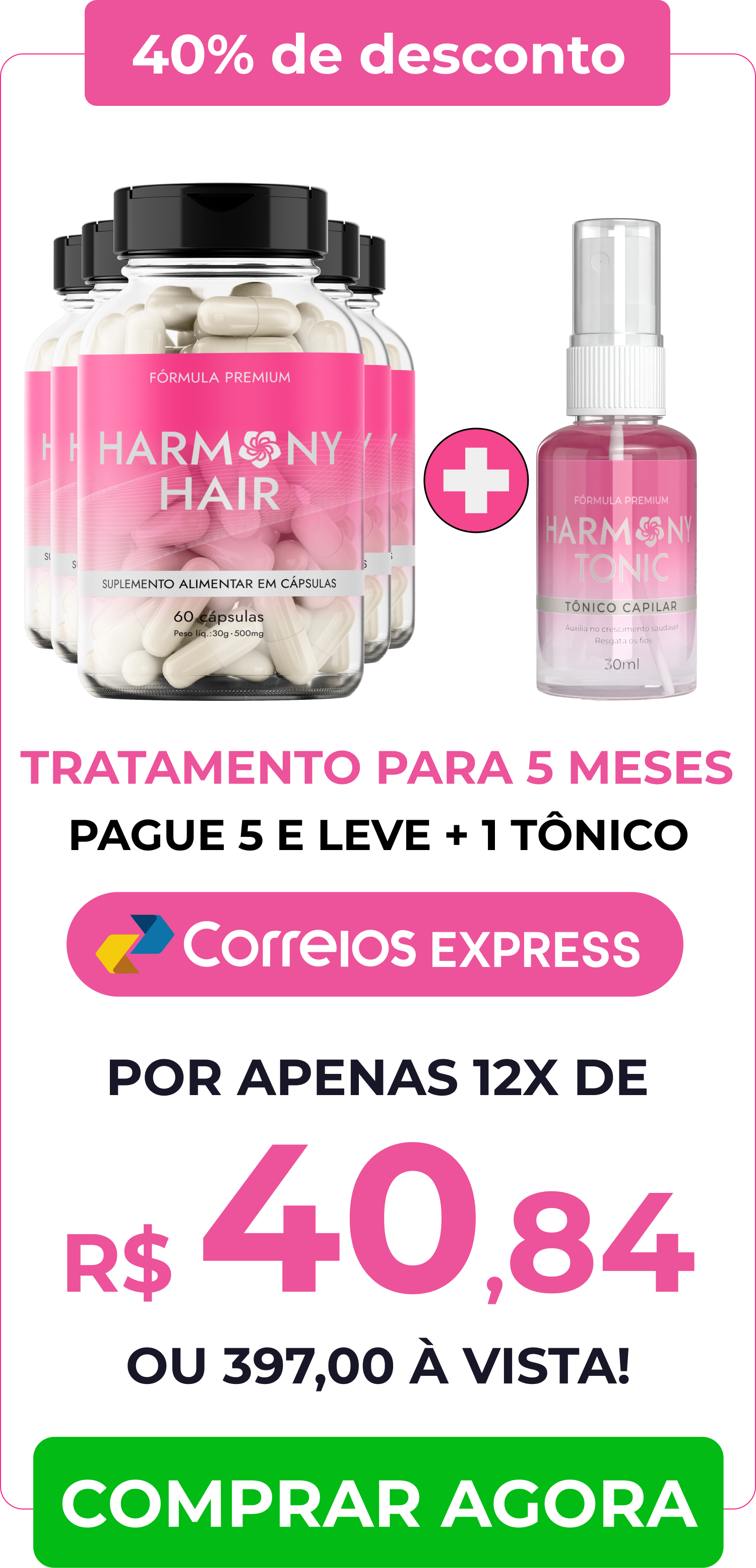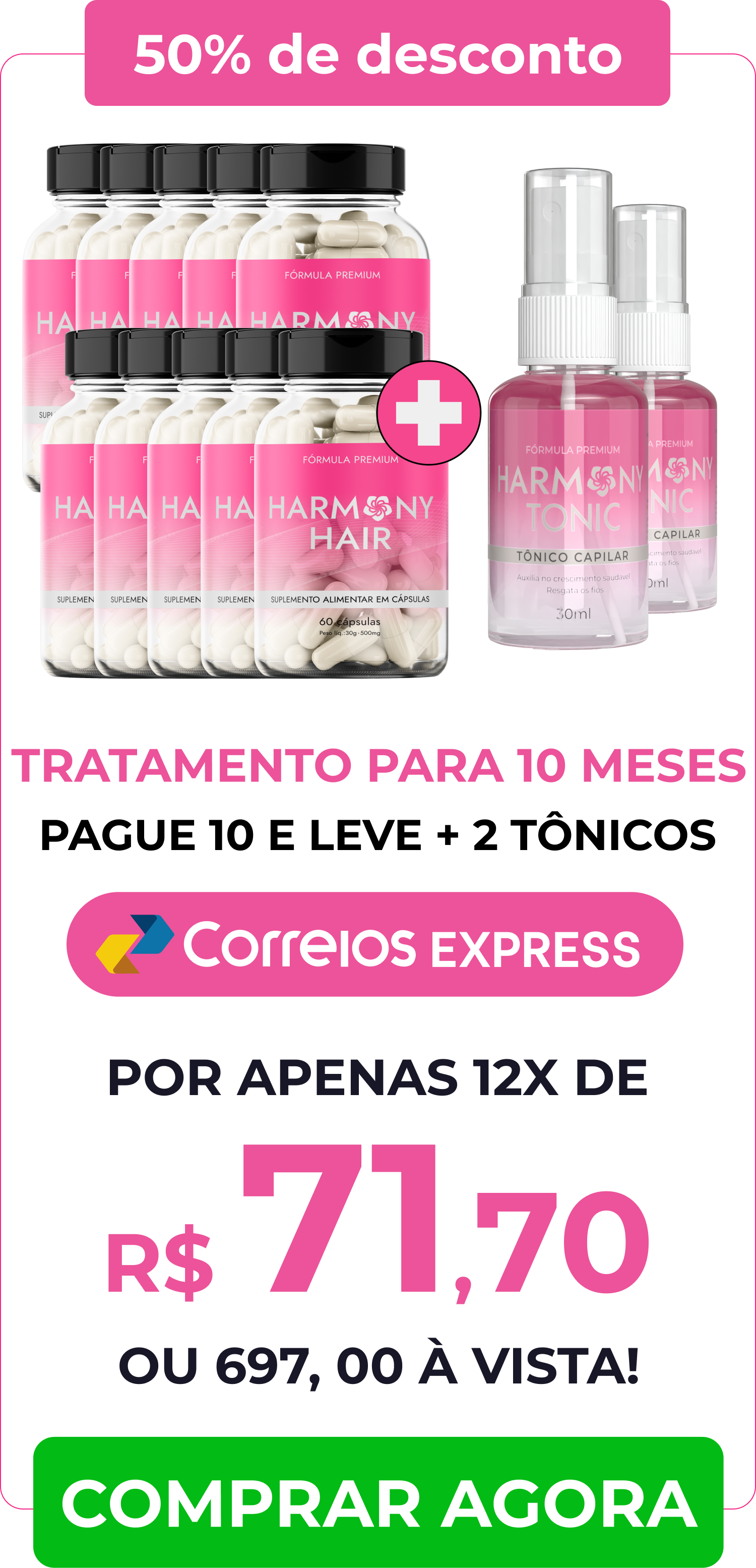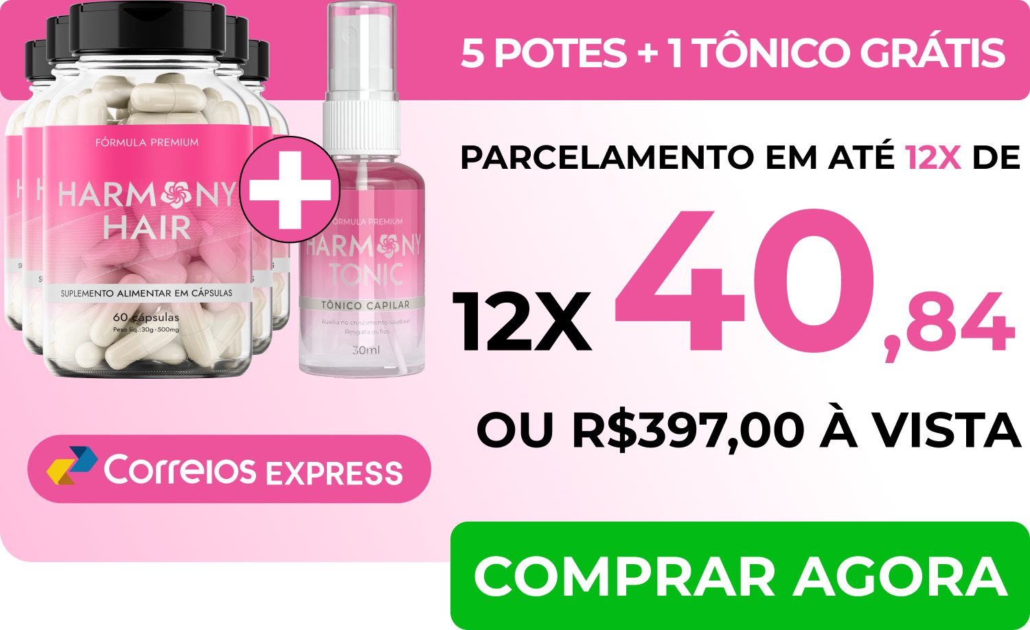 Basta escolher o kit que mais combina com você. Harmony Hair pode ser pago a vista, através de boleto bancario, pix ou através de cartão de crédito parcelado em até 12x.